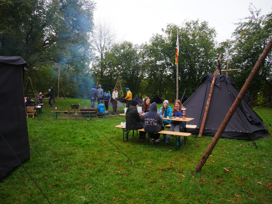 Während die Teams der anderen Altersstufen normalen Stammtreff hatten, bauten die Kundschafterteams Zelte auf, um sich für die Übernachtung bereit zu machen. Nach einem gemeinsamen Essen versammelten sich alle Kinder am Lagerfeuer um ein Spiel zu spielen, Lieder zu singen und einer Andacht zu lauschen. Nachdem alle, eingekuschelt in warme Schlafsäcke und Decken, die Nacht gut überstanden hatten, waren die Kinder am Samstag dann in ihren Teams unterwegs. Während die einen Teams auf der Sophie blieben um Kisten zu stapeln, ihren Teamplatz weiterzubauen oder zu kochen, waren andere Teams wandern oder machten eine Fahrradtour durch den schönen Herbstwald.
