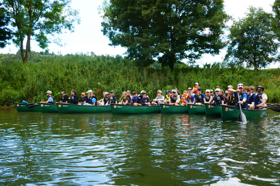 Früh am Morgen starteten wir bei strahlendem Sonnenschein nahe Horb und ließen die acht Boote zu Wasser. In jedem Kanu hatten vier Rangers platz und mit einem Paddel in der Hand ging es los. Viele Stunden fuhren wir den Neckar hinunter. Hier und da mussten wir mal aussteigen, um die Kanus etwas zu schieben, da es aufgrund des heißen Sommerwetters etwas wenig Wasser im Fluss gab. Bei den warmen Temperaturen störte aber ein kleiner Ausflug ins kühle nass niemanden und viele gingen nebenher auch freiwillig baden. Das Mittagessen kochten wir auf unserem Sturmkocher und die leckeren Maultaschen stärkten uns für die weiteren Tour. Etwas Erholung im Schatten und ein Schokoriegel durften natürlich auch nicht fehlen, bevor es danach wieder weiter ging mit Paddeln. Am Ziel angekommen gab es noch eine große Wasserschlacht und ein leckeres kühles Eis, nachdem alle Boote wieder auf dem Anhänger und alle Paddel und Schwimmwesten in den Autos verstaut waren. Ein richtig schöner und auch herausfordernder Tag ging viel zu schnell zu Ende, aber bald steht ja schon das nächste Highlight an: Bundescamp in Thüringen.