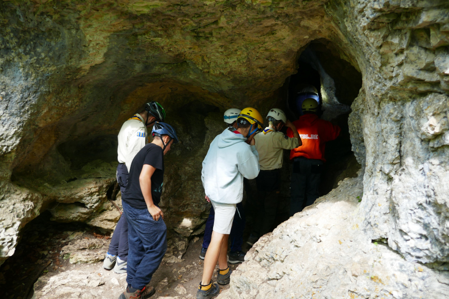 So sind am Samstag um zehn Uhr 30 tapfere Pfadfinder und ihre Leiter am Parkplatz der Gustav-Jakobs-Höhle angekommen, um ein neues Abenteuer zu wagen. Nach einer kurzen Einweisung und dem Helmcheck ging es los, den steilen Weg hinab zum Höhleneingang. Für manche eine echt große Überwindung sich durch die enge Höhle fortzubewegen. Die Stirnlampe ist mir das wichtigste Utensil, um die 300 Meter zu bewältigen. Nach einer Stunde sind alle wohlbehalten wieder raus und zu Fuß geht es danach weiter zur Falkensteiner Höhle bei Bad Urach. Dort angekommen haben wir alle großen Hunger und es gibt erstmal ein paar leckere Maultaschen, die jedes Team auf dem Trangia zubereitet. Im Anschluss werden die passenden Neoprenanzüge rausgesucht und dann geht es in die Höhle rein. Das 7 Grad kalte Wasser erfrischt uns und die Zehen fangen bald an zu frieren. Aber dennoch wagen wir uns bis zum ersten Siphon rund 400 Meter in die Höhle rein. Ein Abenteuer das so schnell keiner mehr vergisst. Dankbar und glücklich kommen alle wieder zurück und wärmen sich in der warmen Mittagssonne auf.