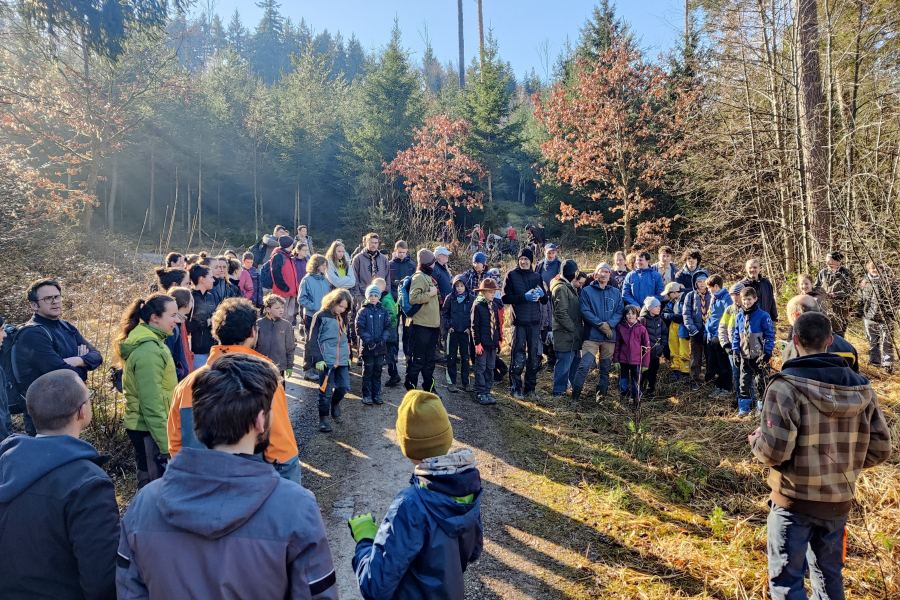 Dort gibt es einige Bestände, wo viele Fichten eng stehen und aufwachsen – um stabil wachsen zu können brauchen sie mehr Platz. Auch soll den klimastabileren Eichen und anderen Baumarten geholfen werden, aber im Kampf um das Licht gegen die Fichte brauchen diese Baumarten Unterstützung. Mit den Stangen, die wir deshalb dort gefällt haben, können wir die Bauten auf unserem Camp und unserer Rangerwiese bauen, und wir bekommen dazu noch das Brennholz, das wir jede Woche brauchen. Morgens um 8 Uhr hört man am 02. März die ersten Sägen im Wald. Nicht viel später kommen über 120 Rangers, Eltern und Leiter aus verschiedenen Stämmen, um die Stangen aus dem Wald zu tragen. Dank so vielen fleißigen Händen war mittags um 13 Uhr das meiste schon geschafft. Wir sind Gott sehr dankbar für bestes Wetter, guten Fortschritt, viel Spaß und auch viel Bewahrung bei der Arbeit!