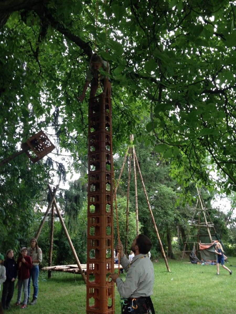 Hoch hinaus ging es beim Sprudelkisten-Stapeln - gut gesichert im Klettergurt.