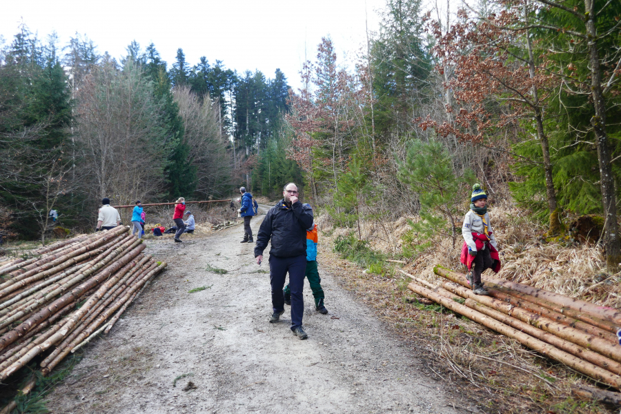 Um 08.15 Uhr ertönt die erste Motorsäge im Wald, bald kommen mehr dazu. Knapp 2 Stunden später kommen die Kinder und Eltern an, um die ganzen gesägten Fichtenstangen aus dem Wald an den Weg zu ziehen.