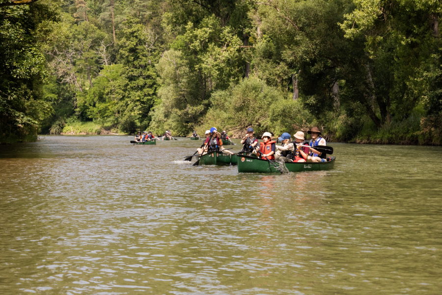 Am nächsten Morgen ging es früh los. Nach einem kurzen Frühstück und einem letzten Einladen vom persönlichen Gepäck sind wir Richtung Horb gefahren. Dort haben wir Wasserdichte Packsäcke gepackt, die Kanus zum Wasser getragen und Schwimmwesten angezogen, und schon konnte es losgehen. Mit knapp 30 Rangers waren wir in 8 Booten auf dem Wasser. Obwohl es die letzten Wochen viel geregnet hat, war es nicht zu viel Wasser im Neckar. Kurz vor Rottenburg sind wir – nach einem Mittagessen zwischendurch – wieder an Land gegangen, und zurück zur Rangerwiese gefahren. Dort mussten wir noch die Zelte abbauen, und dann war der Nachmittag auch schon vorbei. Bei tollem Wetter haben wir die Aktion dieses Jahr wieder sehr genießen können.