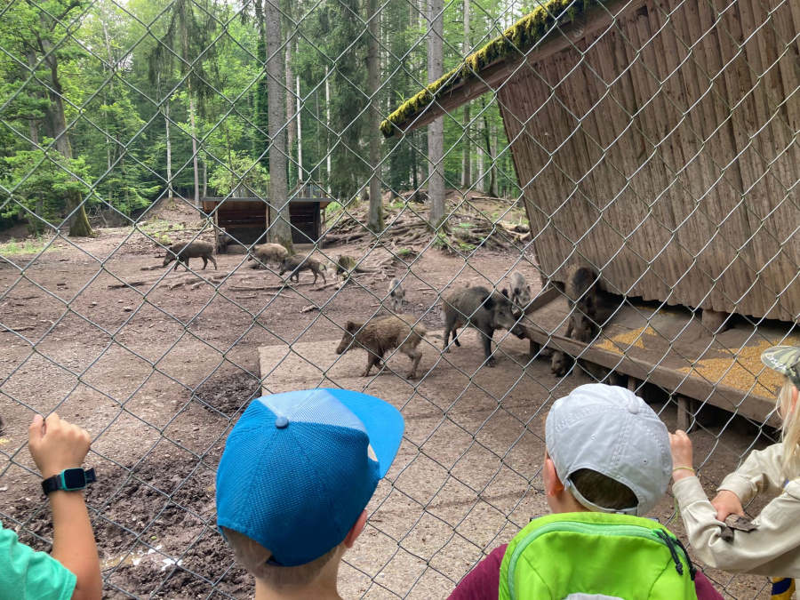 Endlich angekommen gab es nach der Begrüßung auf dem Parkplatz zuerst mal ein Spiel, wobei es darum ging, anhand von Tiergeräuschen Pärchen zu finden – wie bei Memory. Nach einer kurzen Wanderung durch den Wald kamen wir dann im Wildgehege an und sahen zuerst eine ganze Anzahl Wildschweine in allen Größen – vom Frischling bis zum Keiler. Sie waren gerade mit leckerem Mais gefüttert worden und deshalb ganz in der Nähe vom Zaun. Dann gab es Zeit, um sich auf dem tollen Spielplatz auszutoben oder zusammen mit dem Teamleiter auf die Suche nach weiteren Tieren zu gehen wie z.B. Hirsche und Mufflons. Natürlich darf auch das Essen nicht zu kurz kommen und nach dem Spielen konnten wir uns am sehr reichhaltigen Kuchenbuffet sattessen und dann frisch gestärkt einer Geschichte von Max und seinem imaginären Hund lauschen, die uns deutlich gemacht hat, dass Jesus unser bester Freund und immer an unserer Seite ist. Dann war es auch schon wieder Zeit zurück zum Parkplatz zu laufen und heimzufahren. Alle waren sich einig, dass es ein sehr schöner Nachmittag war.